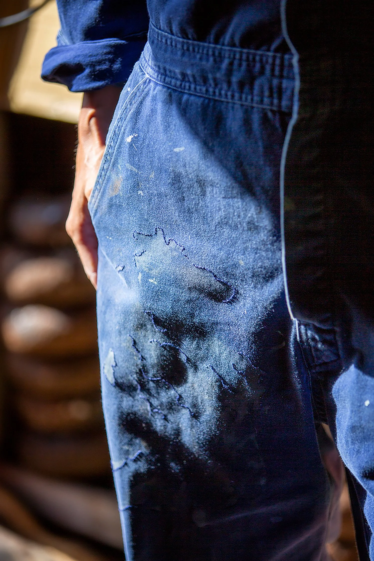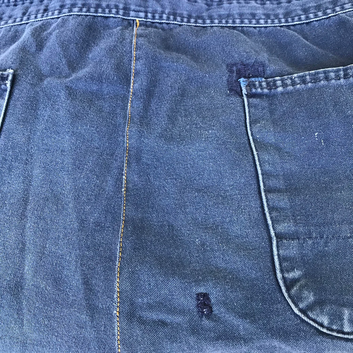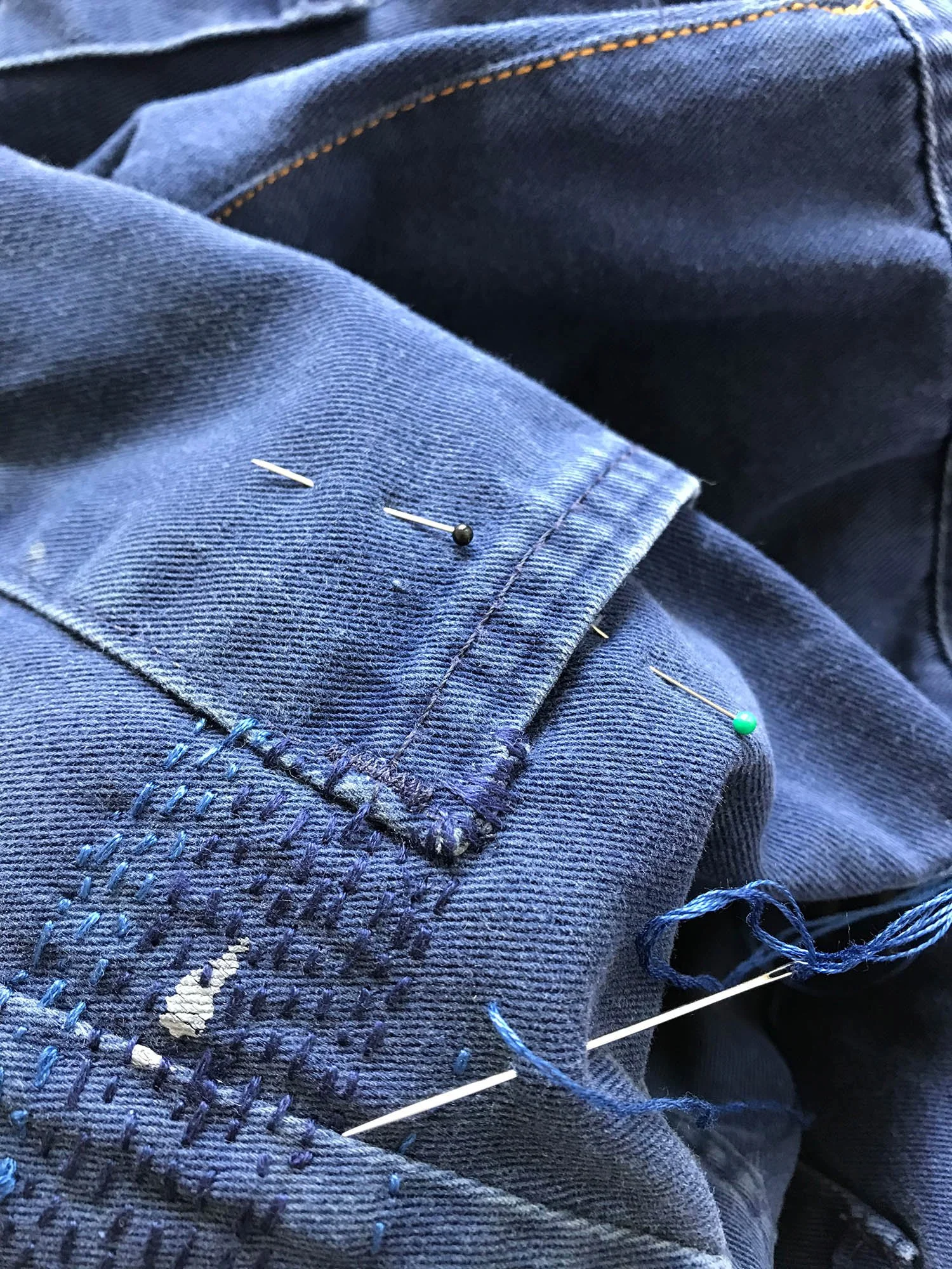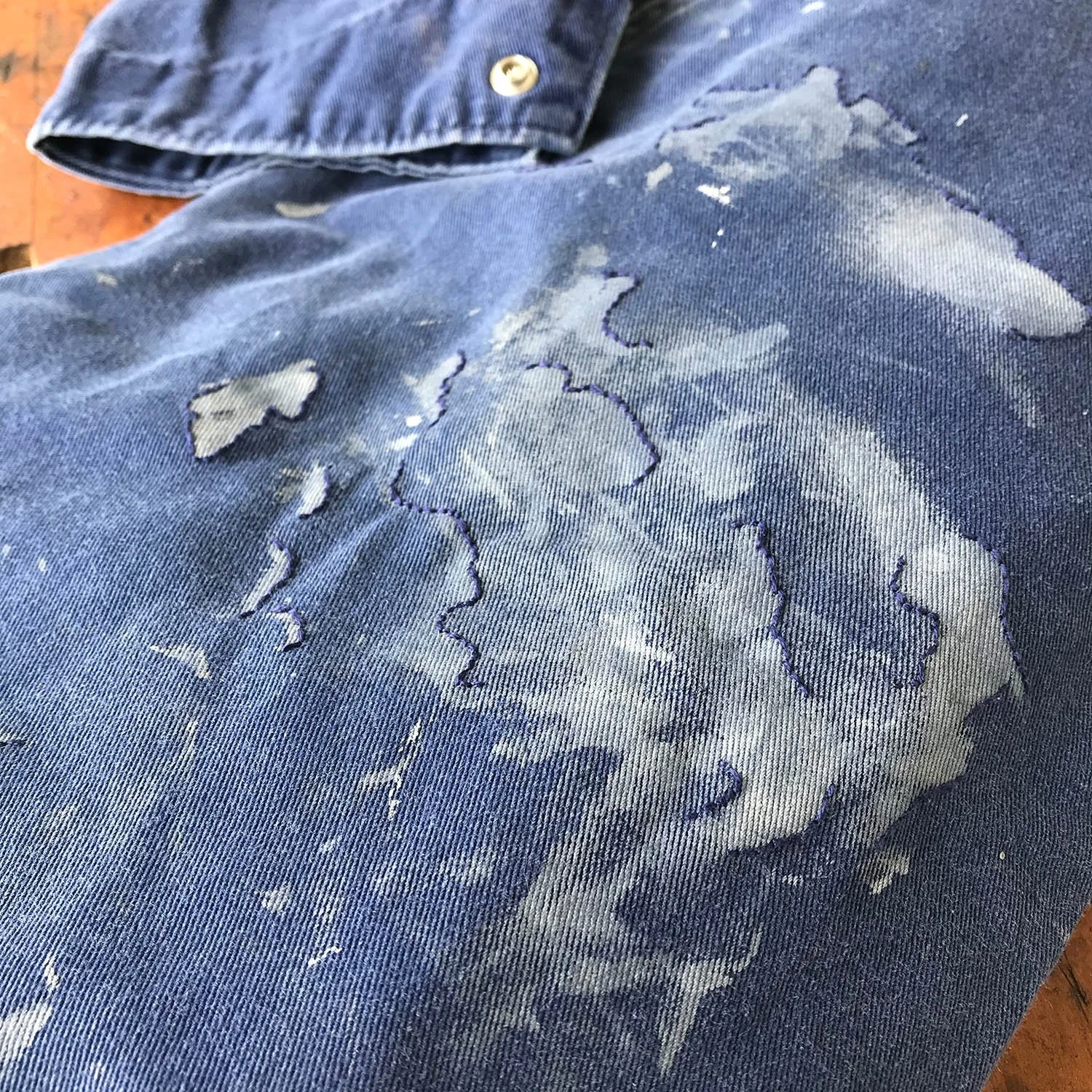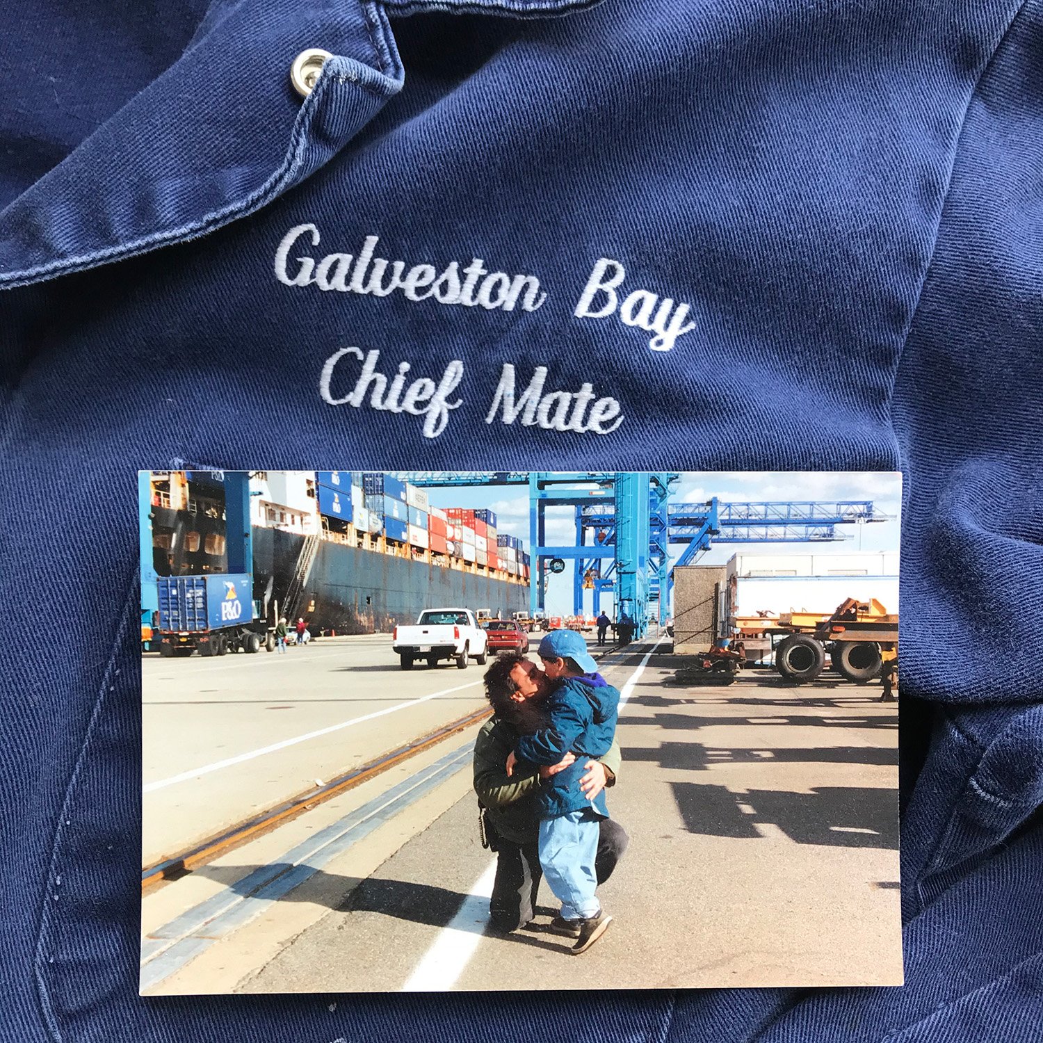 The second story is also centered around family and the sea. The original owner of the coveralls is a former Chief Mate on a merchant ship. Years later as a retired Captain, he passed down his much-coveted coveralls to his son, who remembers greeting his father at the docks (photo). I mended a few seams and embroidered a paint-stained area that reflects the father’s hand-print from decades ago. The coveralls are now a fashion statement for his daughter-in-law but carry a family legacy and memories from a career of hard work on Galveston Bay, TX among other shores.