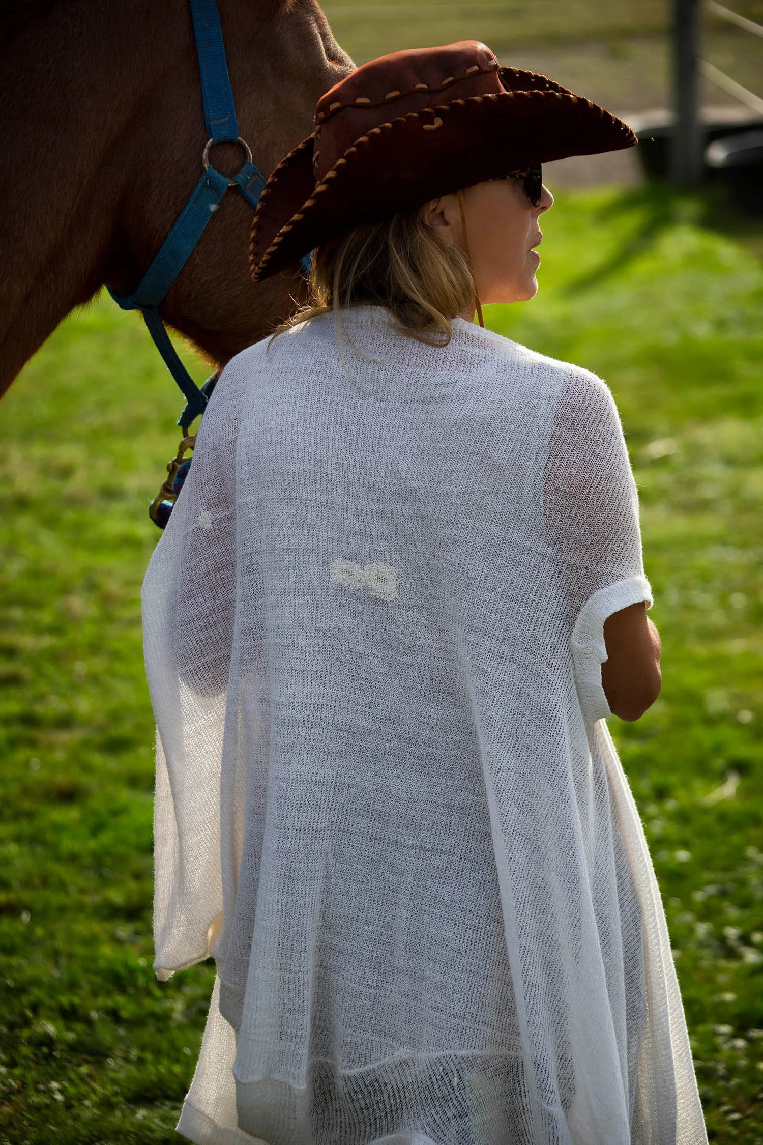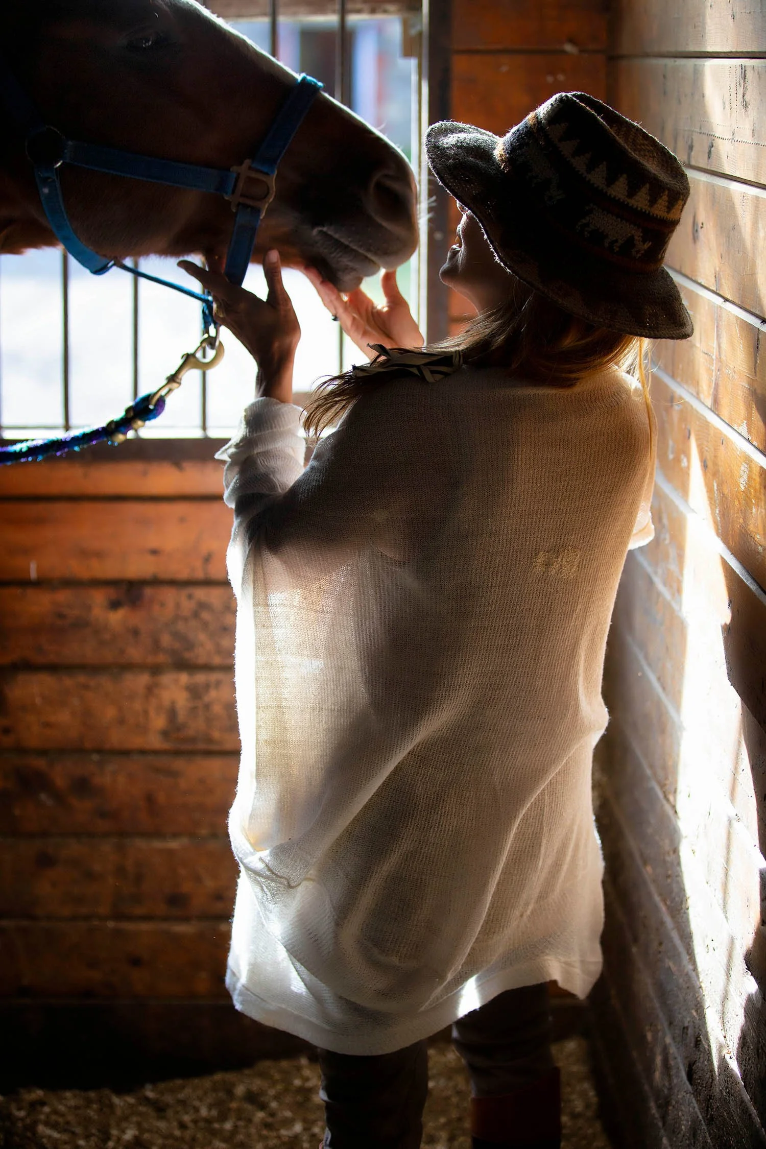 Lynn splits her time between the south coast of Rhode Island and Dominican Republic, so she has specific go-to garments for travel, such as this lacey wrap. When I caught up with Lynn and her horse, Fance, she was wearing her favorite wrap–mended and ready to go.